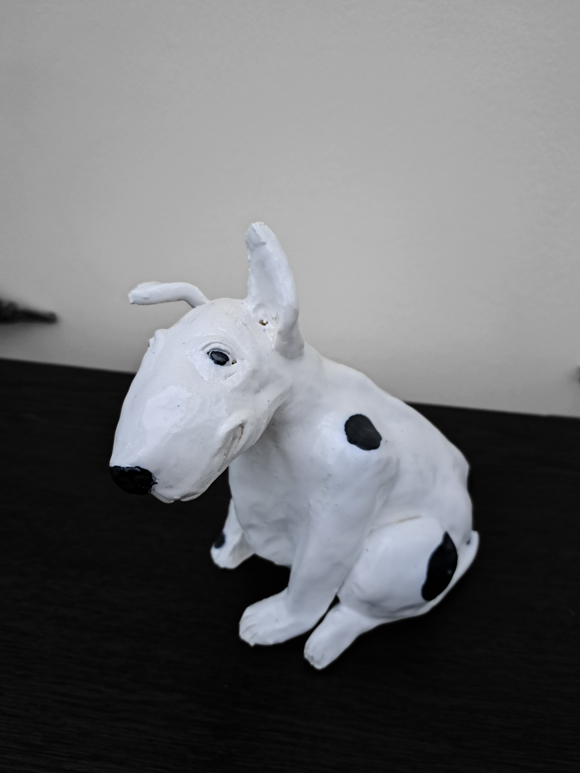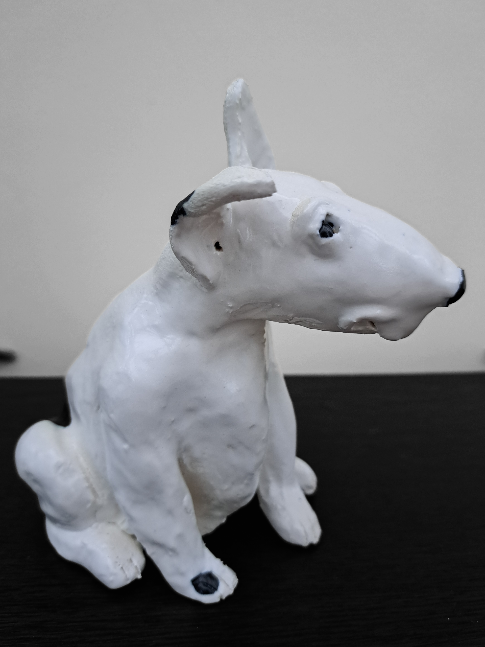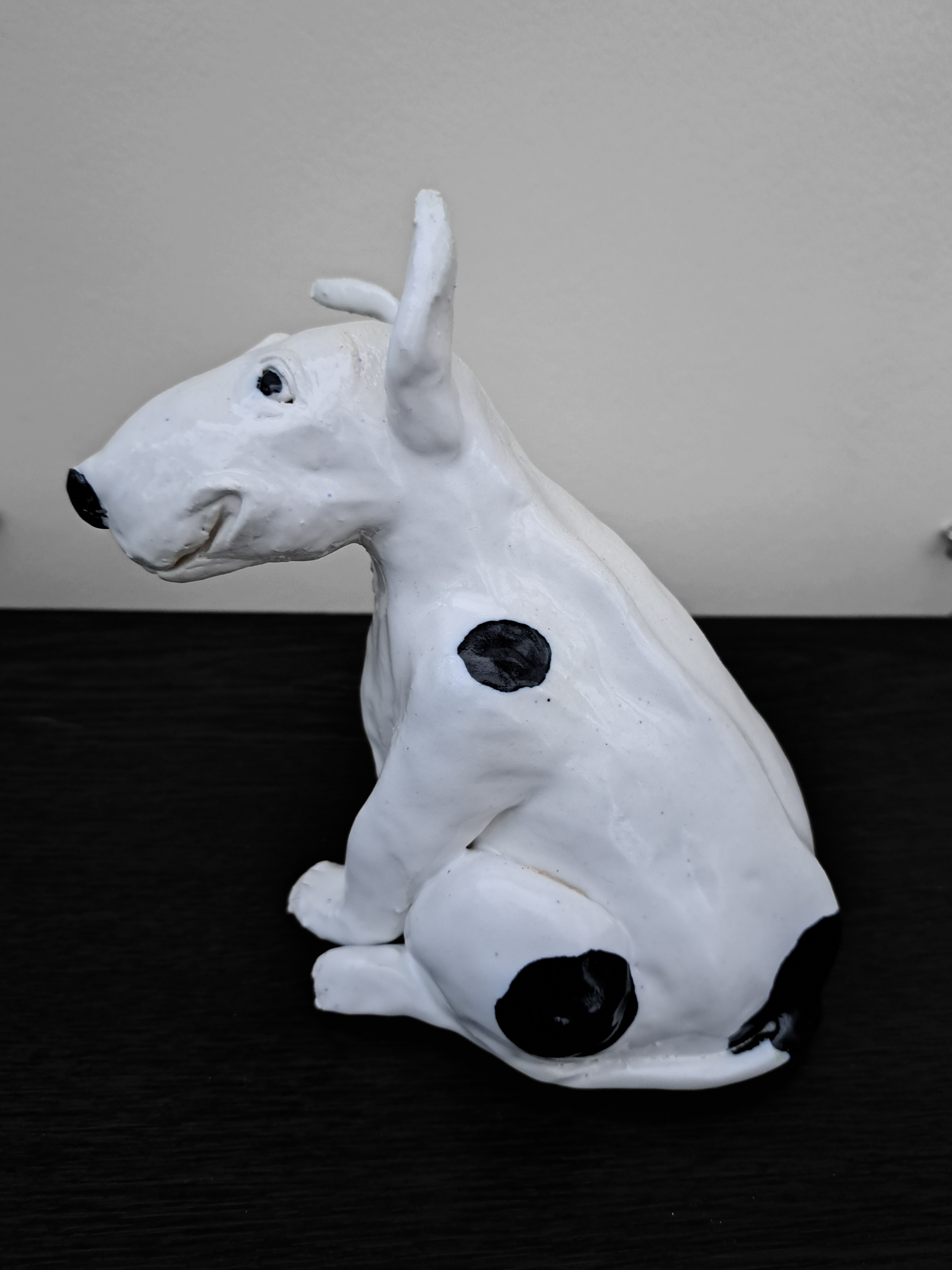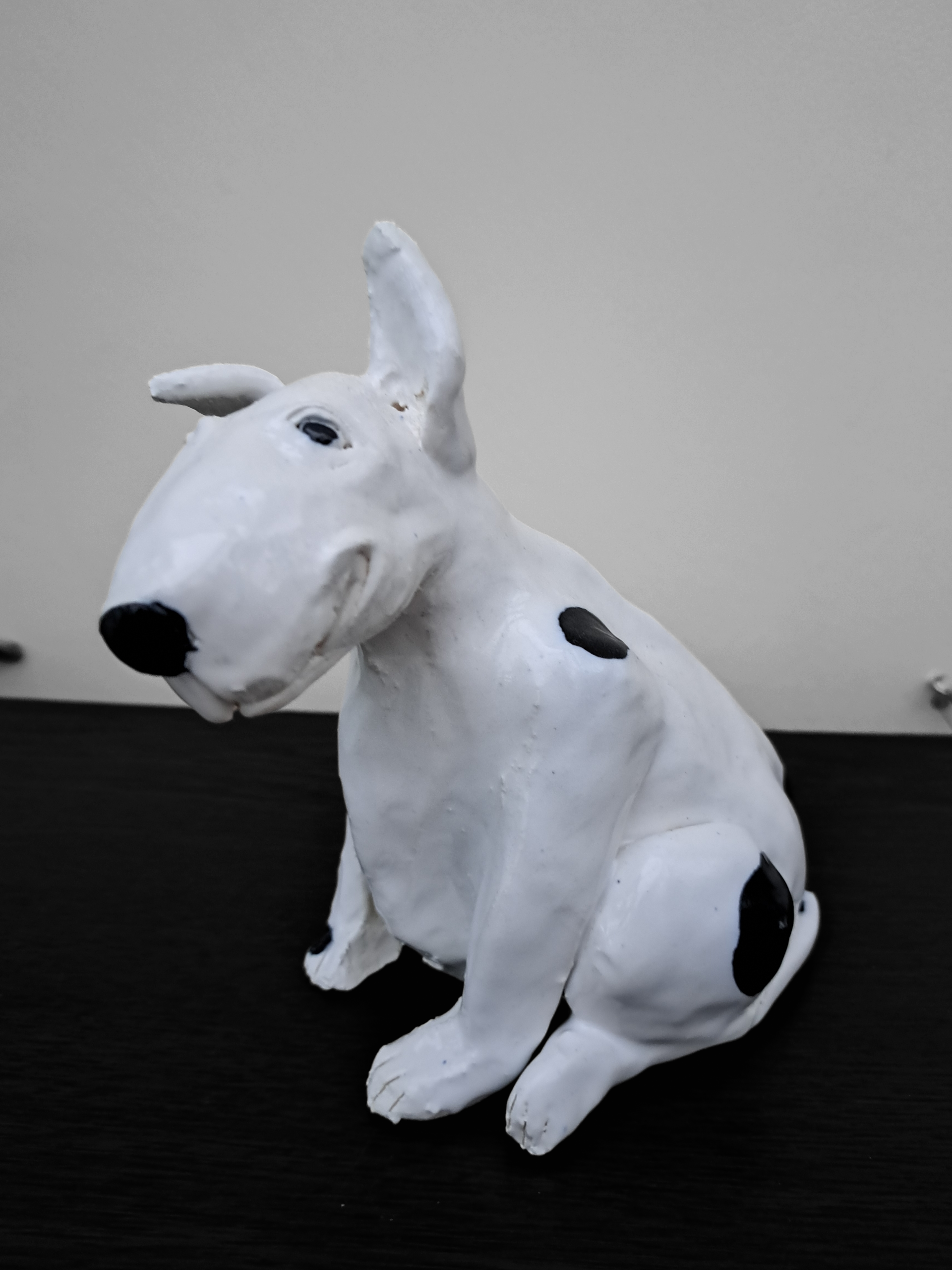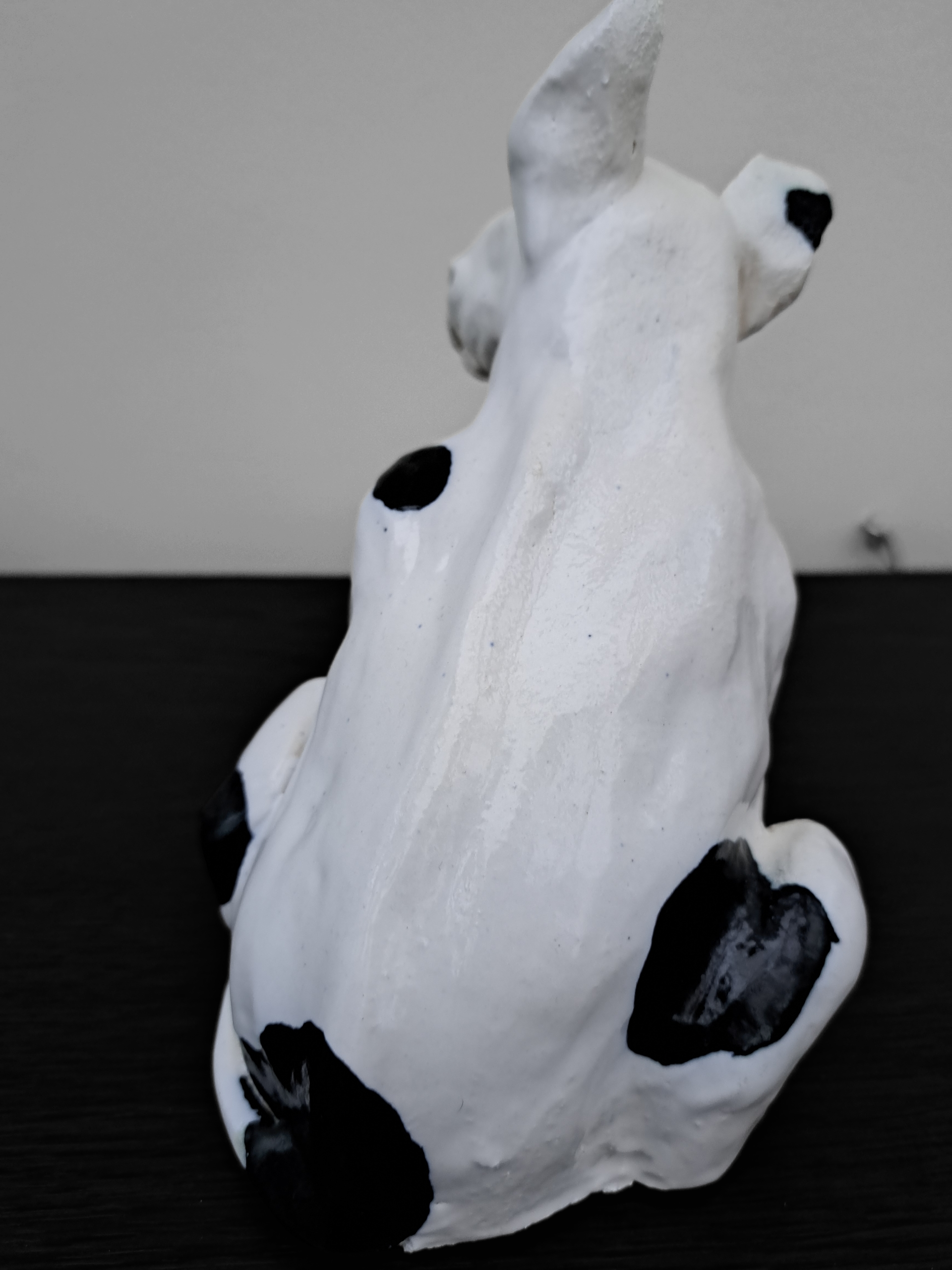 This is a good boy, a very good boy. Hand made in stoneware clay and painted with love. The best companion, he doesn't even need a walk. Could you take him home ? 15.5 cms tall