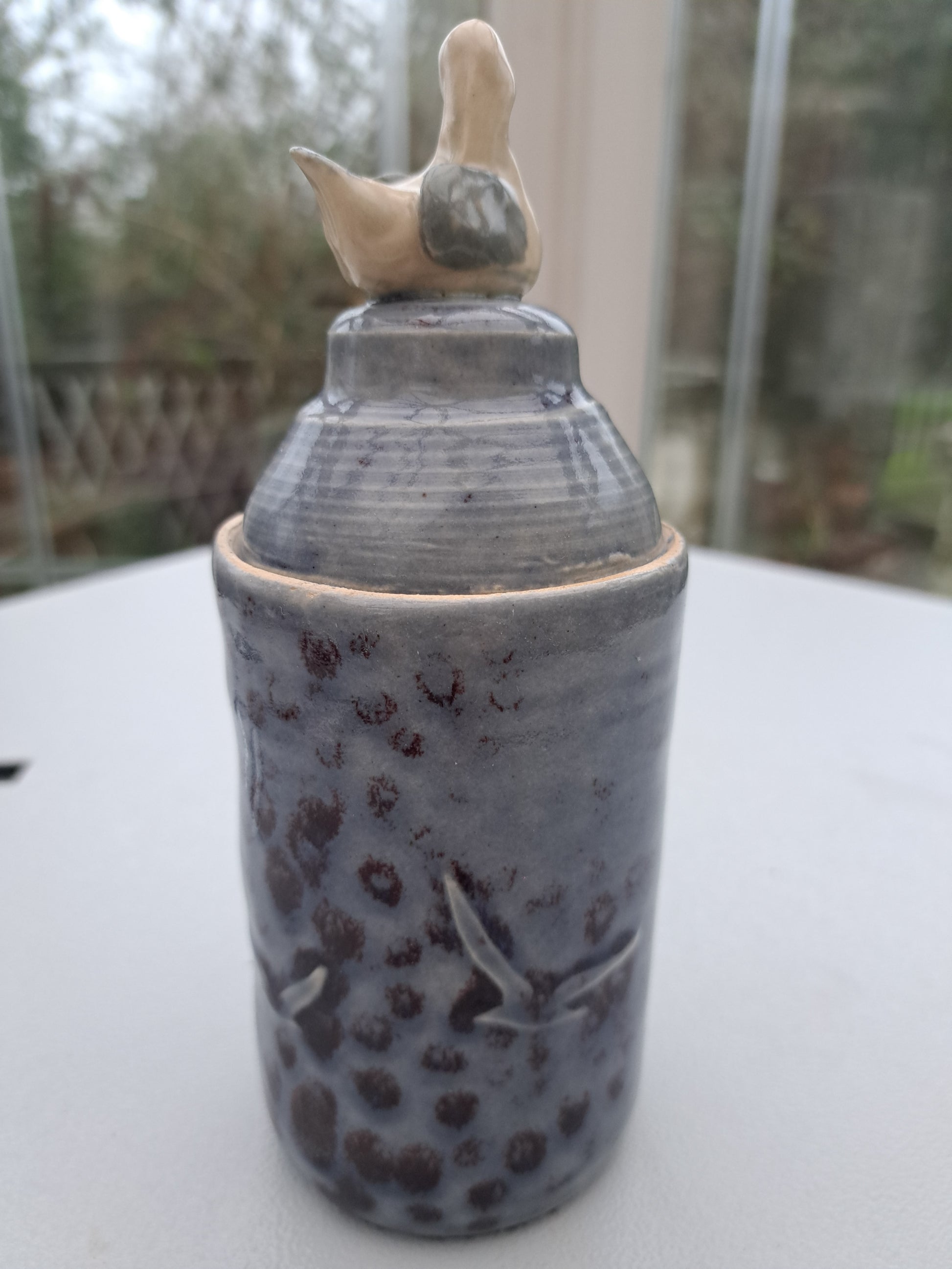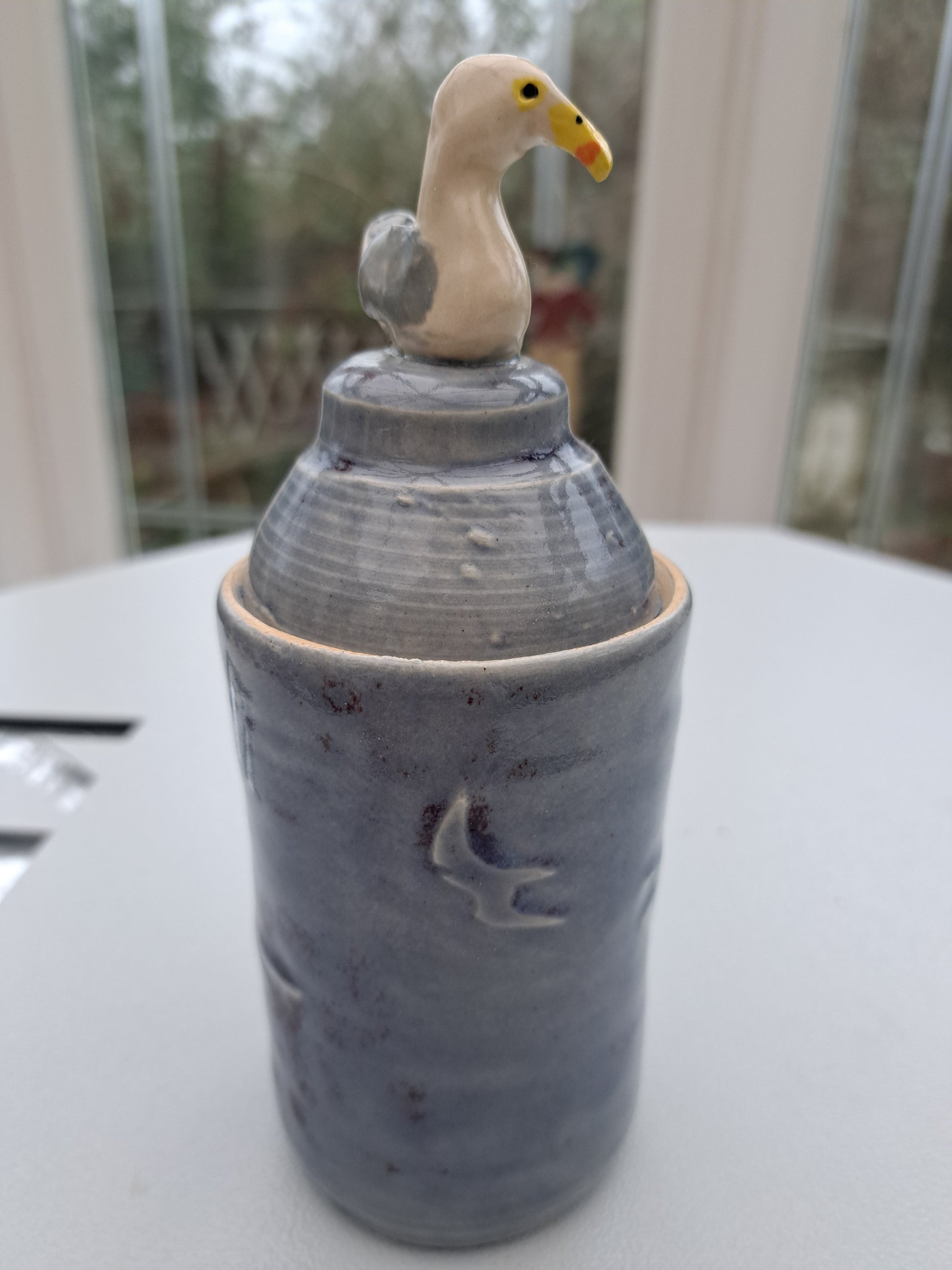 Lidded pot featuring water etched seagulls flying in a stormy sky. Little hand made and painted seagull sits on the lid, a lovely ornament in itself but a great place to stash something special. 19cms high, 8 cms diameter